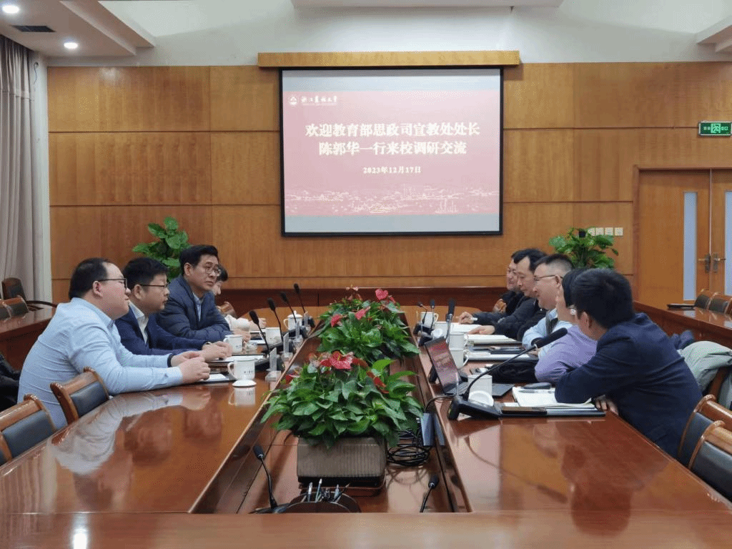 12月17日下午,教育部思政司宣教處處長陳郭華一行來校調研交流智慧思政工作。浙江省教育廳宣傳統戰處處長陳雷、教育部思政司宣教處副處長倪陽等人參加調研。校黨委書記朱斌,黨委副書記施美紅,黨委委員、宣傳部長倪建均,學工部、研工部相關負責人陪同調研。