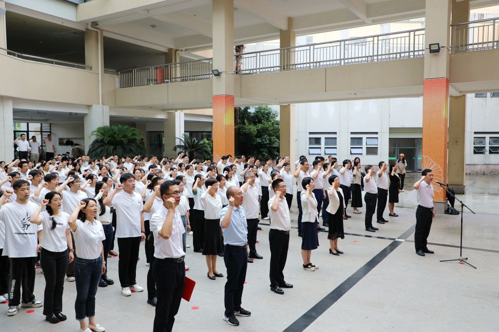 儀式上,全體師生黨員莊嚴宣誓,銘記入黨初心,強化黨員意識。與會領導為新發展黨員代表佩戴黨員徽章。