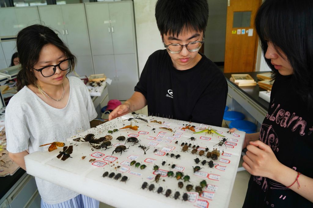 7月11日,浙江農林大學15號學院樓的標本制作實驗室里,該校植物保護專業的學生正在研究昆蟲標本。昆蟲學教學實習是植物保護專業教學環節的重要實踐課程。通過學習制作標本,學生不僅可以了解昆蟲的習性,也更加意識到保護生物多樣性的重要性。