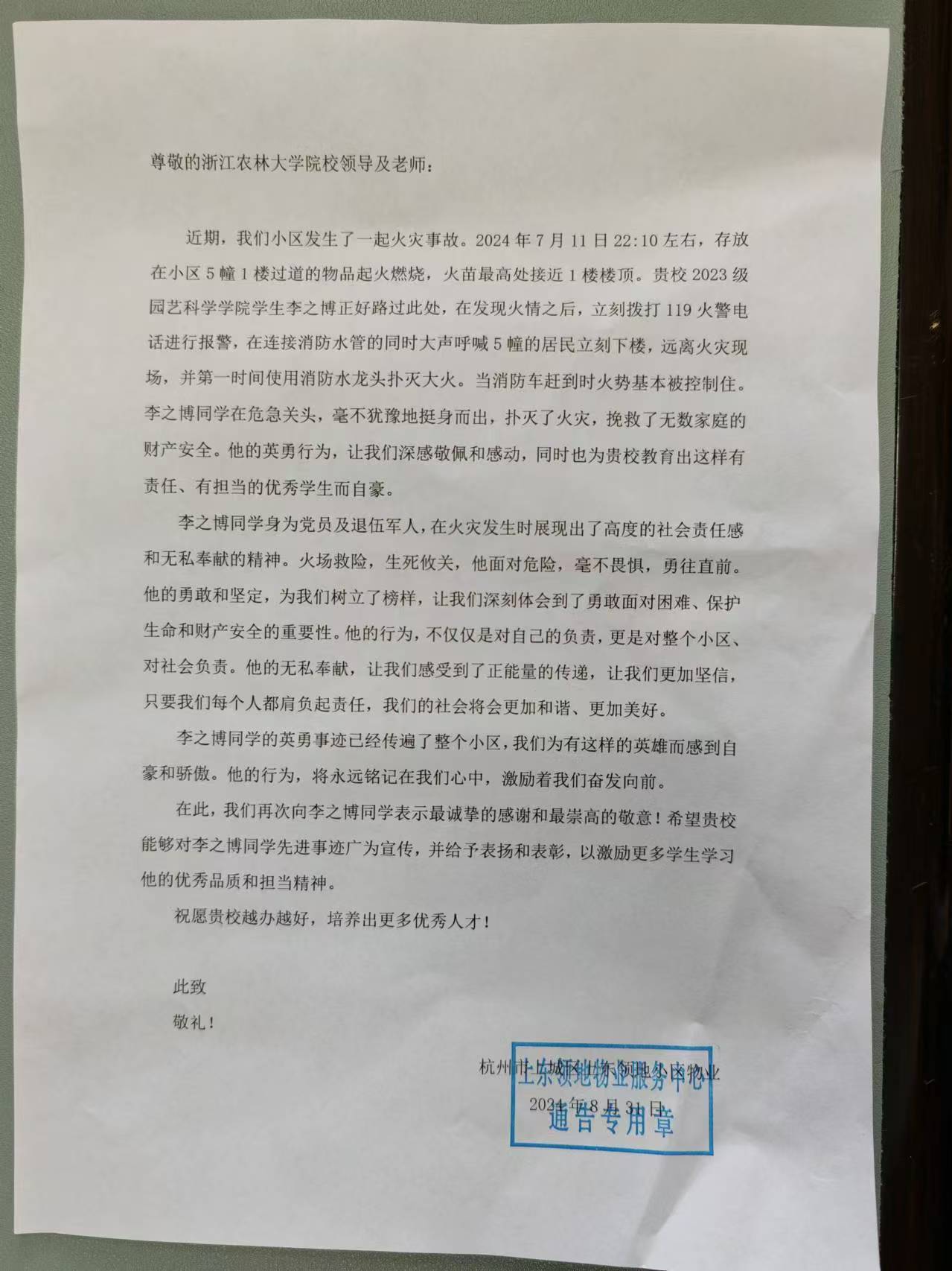 “尊敬的浙江農(nóng)林大學(xué)校領(lǐng)導(dǎo)及老師:近期,我們小區(qū)發(fā)生了一起火災(zāi)事故。2024年7月11日22:10左右,存放在小區(qū)5幢1樓過(guò)道的物品起火燃燒,火苗最高處接近1樓樓頂。貴校2023級(jí)園藝科學(xué)學(xué)院學(xué)生李之博正好路過(guò)此處,在發(fā)現(xiàn)火情之后,立刻撥打119火警電話進(jìn)行報(bào)警,在連接消防水管的同時(shí)大聲呼喊5幢的居民立刻下樓,遠(yuǎn)離火災(zāi)現(xiàn)場(chǎng),并第一時(shí)間使用消防水龍頭撲滅大火……”