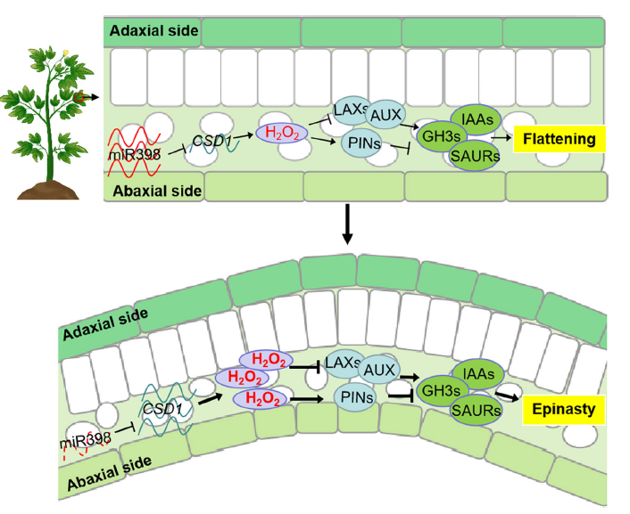 葉片的平展性在植物光能捕獲和光合作用中發(fā)揮關(guān)鍵作用。植物葉片發(fā)生初期平展性形成的分子機(jī)制已比較明確,但成熟葉片平展性的維持機(jī)制尚不清楚。該研究發(fā)現(xiàn),sly-miR398b在番茄葉片的遠(yuǎn)軸面特異性表達(dá)。采用CRISPR/Cas9敲除該基因后,突變體成熟葉片表現(xiàn)為偏上生長,而幼葉保持平展性。敲除sly-miR398b解除了對(duì)其靶基因SlCSD1(編碼Cu/Zn超氧化物歧化酶)的抑制作用,導(dǎo)致遠(yuǎn)軸面SOD活性升高,H2O2積累。H2O2的增加下調(diào)了生長素外排基因表達(dá),誘導(dǎo)了生長素內(nèi)流基因表達(dá),抑制了遠(yuǎn)軸面生長素響應(yīng)信號(hào),使得遠(yuǎn)軸面細(xì)胞增殖和膨大速率均低于近軸面,導(dǎo)致了葉片向下彎曲。外源施用生長素恢復(fù)了突變體的平展性表型。此外,在西瓜、煙草和白菜等作物中均發(fā)現(xiàn)了miR398在葉片遠(yuǎn)軸面的特異性表達(dá),表明該作用機(jī)制可能具有普遍性。