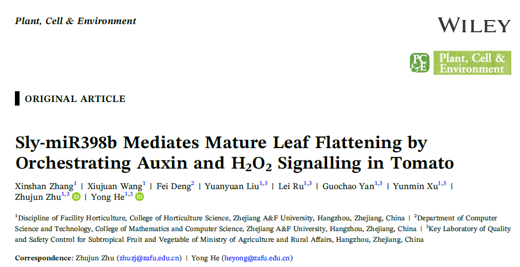 近日,園藝科學(xué)學(xué)院設(shè)施園藝與品質(zhì)調(diào)控團(tuán)隊(duì)在《Plant Cell & Environment》(中科院1區(qū),IF5year=7.6)發(fā)表題為“Sly‐miR398b mediates mature leaf flattening by orchestrating auxin and H2O2signalling in tomato”的研究論文。研究結(jié)果揭示了sly-miR398b在維持番茄成熟葉片平展性的作用機(jī)制,可為設(shè)施茄果類作物光能利用和株型調(diào)控提供依據(jù)。