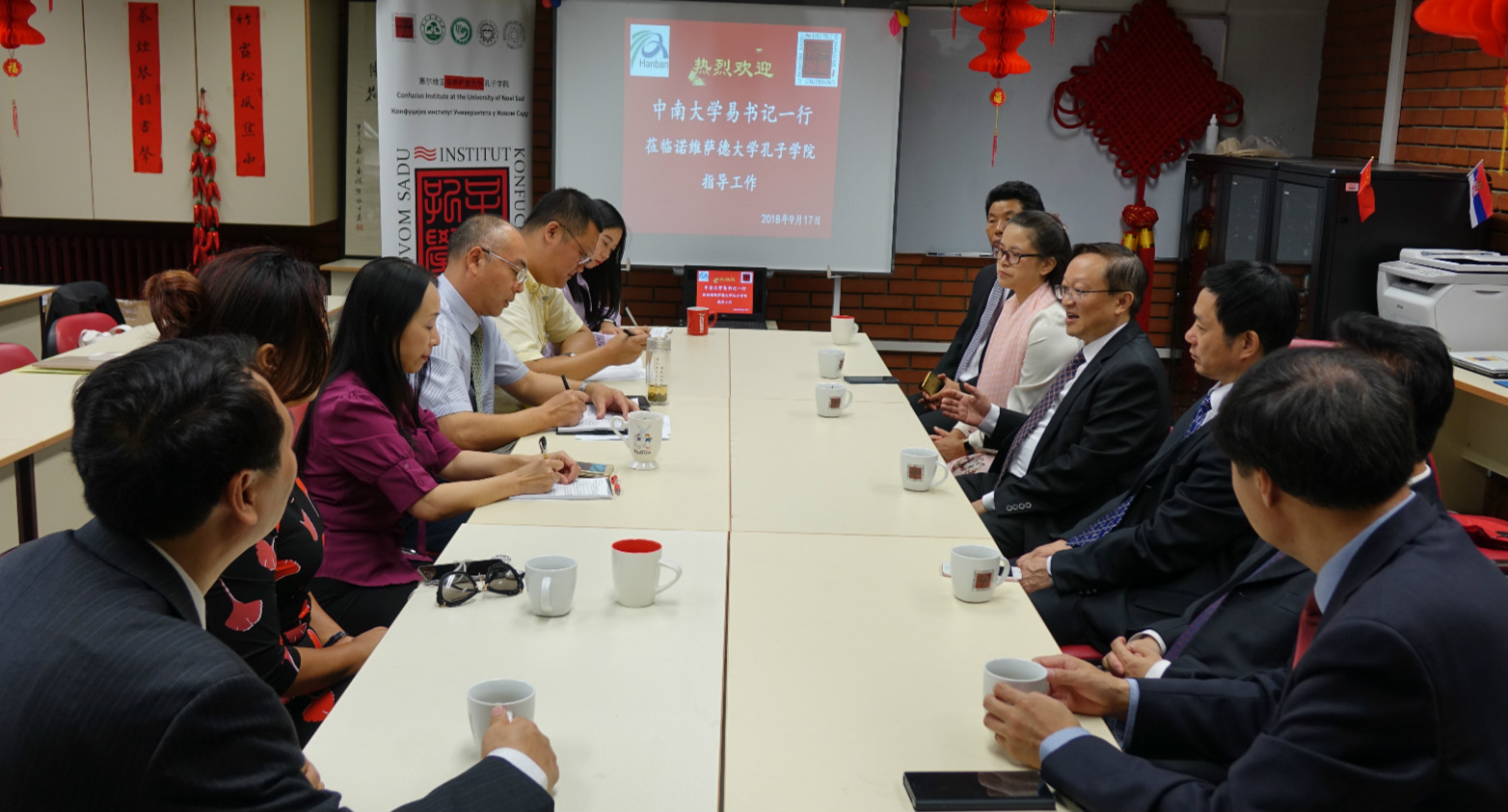 孔院中方院長陳晦對易紅書記一行的到訪表示歡迎和感謝。會上,他簡要地向來訪嘉賓介紹了諾維薩德大學孔子學院的辦學概況及社會環境,并對諾大孔院的辦學特色、發展規模和學生人數等作了較為詳細的講解。陳晦表示,孔院作為一個教育合作平臺,既要從事漢語言教學,也要大力開展文化活動,以適應當地學生及民眾的學習需求與經濟文化交流需要,同時還應該提高歷史站位,契合中東歐地區“一帶一路”建設的主題,努力為中塞兩國培養繼承友誼傳統、繼續友好交往的青少年隊伍,促進兩國友誼的鞏固與傳承及“人類命運共同體”的最終實現。